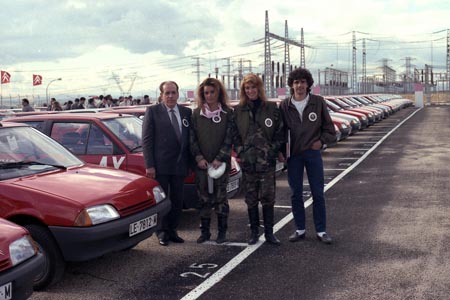 - La presentación del nuevo Citroën AX en el Palacio de Congresos de Madrid fue otro gran evento. Norma Duval tuvo el honor de bautizar ese modelo con champán. Posteriormente disfrutamos de una comida especial en unas instalaciones desmontables ubicadas en la carretera Madrid-Torrejón, donde nos sirvieron marisco traído nuevamente por Casa Simón. Finalmente, allí recogimos nuestro reluciente Citroën AX 11 rojo.